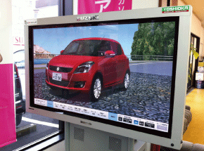 当店では、スズキ大型モニターシステムを導入しており、50インチの大型モニター上でお客様が知りたい情報を画面に映し、カタログや口頭ではお伝えしきれないクルマの情報をタッチペンの簡単操作で見ることができるます。そのリアリティある画像がお客様のクルマ選びをサポートします。